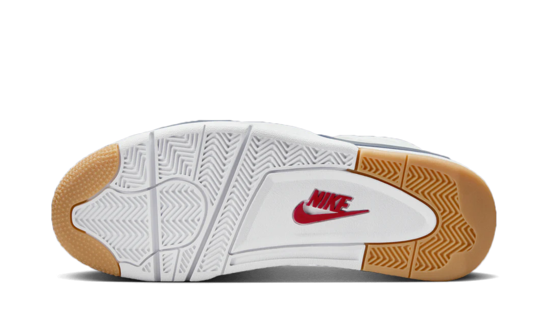 Summit White leather builds the base, offset by navy hits on the molded eyelets, heel tab, and midsole. A bright red Jumpman logo on the tongue and insole pops against the neutral tones, while Nike SB branding on the heel makes the crossover official. Classic AJ4 elements like the mesh panels and lace wings remain intact, grounding the sneaker in Jordan heritage.